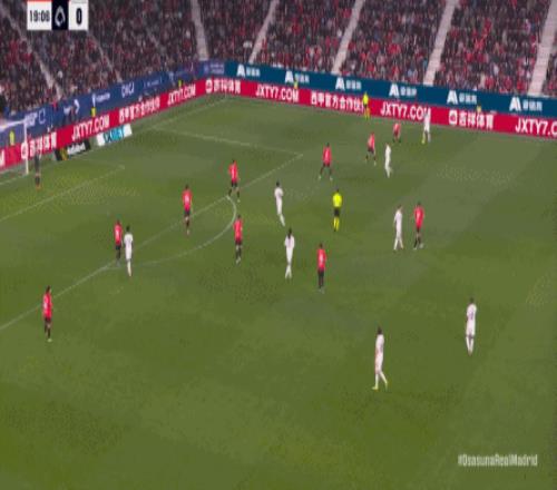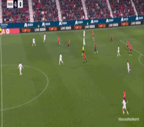 第78分鐘,皇馬在高位人盯人的時(shí)候出現(xiàn)問題,讓奧薩蘇納打到了前場(chǎng),而且再次打出了傳中進(jìn)攻的威脅: