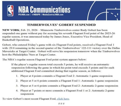 戈貝爾在周六的比賽前已有6個(gè)惡意犯規(guī)積分。在森林狼主場標(biāo)靶中心122-111戰(zhàn)勝獨(dú)行俠的比賽中,這位四屆最佳防守球員在第二節(jié)末段因一次對(duì)巴格利的動(dòng)作被判惡意犯規(guī)。該球最初吹罰為普通犯規(guī),但經(jīng)裁判回看后,認(rèn)定戈貝爾對(duì)巴格利頸部有不必要的揮擺接觸,遂改判為惡意犯規(guī)。他將在明日森林狼主場對(duì)陣費(fèi)城76人的比賽中執(zhí)行禁賽。