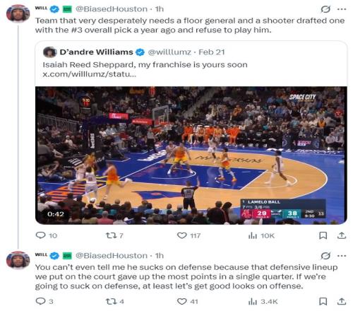 休媒:火箭隊很需要一位防守型中鋒與一個投手,一年前他們用探花簽選中了投手,可關(guān)鍵時刻卻不讓謝潑德登場。你總是說謝潑德防守端表現(xiàn)糟糕,可我們此役是輸在進(jìn)攻端,單節(jié)丟33分還考慮防守嗎?至少讓球隊在進(jìn)攻端有所作為吧。