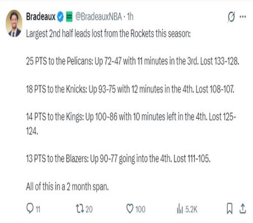 休媒曬出過去兩個月內(nèi),火箭隊已經(jīng)有四次下半場領(lǐng)先至少13分的情況下被逆轉(zhuǎn)了,最慘烈的一場是下半場領(lǐng)先鵜鶘25分卻被逆轉(zhuǎn)了。這場是領(lǐng)先尼克斯18分被逆轉(zhuǎn)。