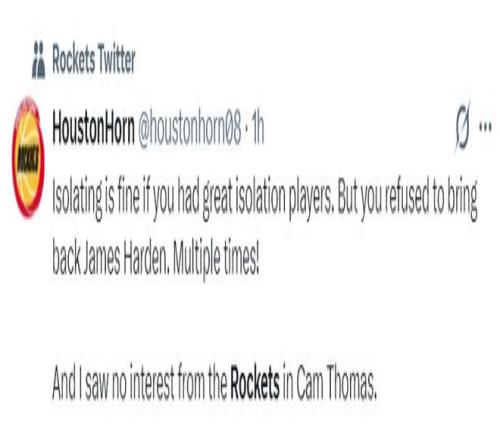 休媒:如果火箭有很多防守出色的球員那么采取這樣的戰(zhàn)術(shù)無可厚非,但如今火箭防守端也并沒有太出色。你們還執(zhí)意拒絕哈登回歸甚至不止一次,而且火箭隊還對進(jìn)攻球員卡姆-托馬斯不感興趣。