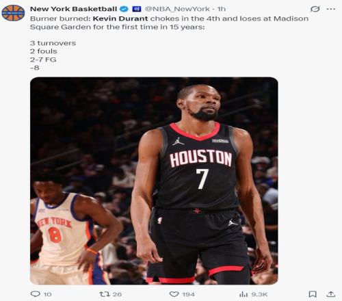 尼克斯媒體:KD在關(guān)鍵時(shí)刻掉鏈子,他在末節(jié)發(fā)揮失常,這是他在15年來(lái)首次在麥迪遜廣場(chǎng)花園球館輸球。