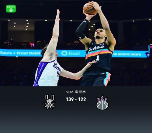 第四節(jié)馬刺文班亞馬拿下8分,國(guó)王邁克德莫特拿下8分,最終馬刺139-122戰(zhàn)勝國(guó)王