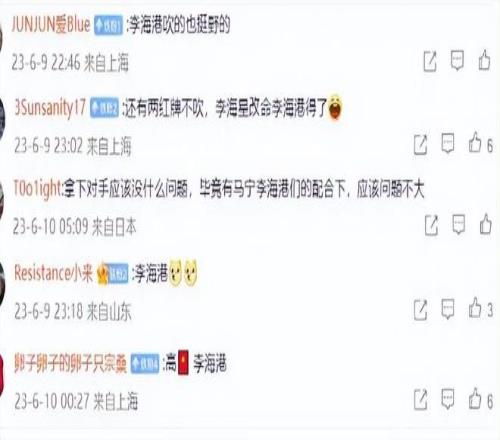 2023賽季6月上海海港在主場(chǎng)2比1擊敗南通支云的比賽中,當(dāng)值主裁判李海新因多次偏袒主隊(duì)而在賽后被球迷美其名曰:“李海港”(下圖)。