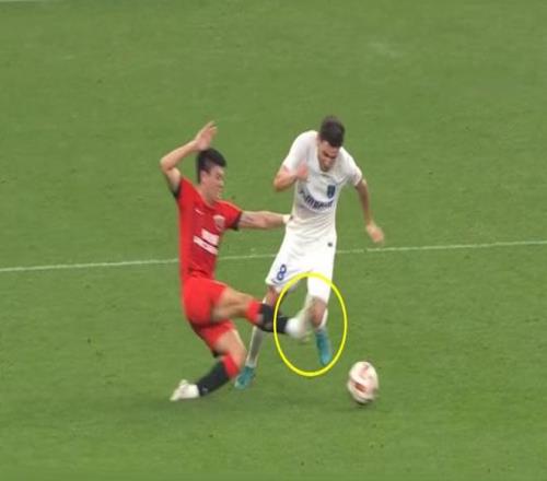 接著,魏震也在一次飛鏟中踹到對(duì)手的小腿(下圖),李海新照樣沒有任何表示,黃牌都沒有。難道是李海新的執(zhí)法風(fēng)格寬松,少出牌?未必。