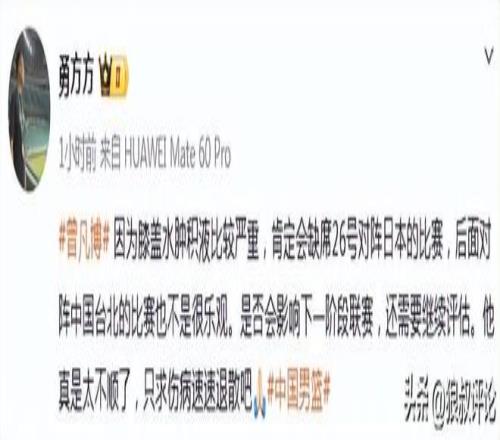 北京時間2月22日,根據(jù)北京記者“勇方方”發(fā)文:曾凡博因為膝蓋水腫積液比較嚴重,肯定會缺席26號對陣日本的比賽,后面對陣中國臺北的比賽也不是很樂觀。