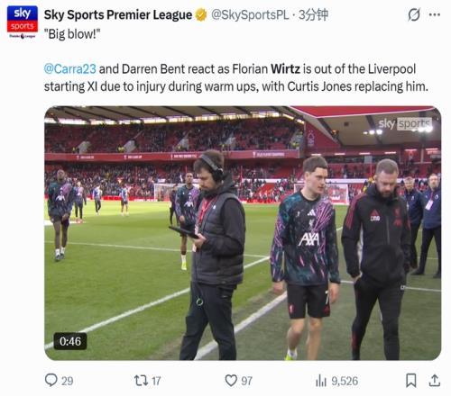 利物浦首發(fā)陣容臨時(shí)更新,維爾茨熱身受傷,柯蒂斯瓊斯頂替先發(fā)
