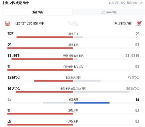 半場12腳,森林是2015年5月以來英超上半場對利物浦射門最多球隊