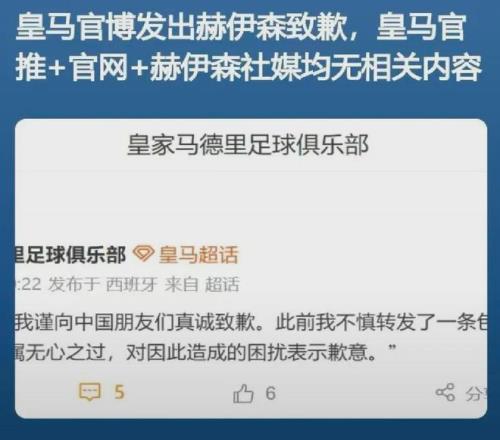 目前,皇家馬德里足球俱樂部賬號(hào)分別在微博和某站發(fā)布了道歉動(dòng)態(tài),內(nèi)容如下: