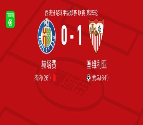 北京時(shí)間2月22日西班牙足球甲級(jí)聯(lián)賽 聯(lián)賽 第25輪,赫塔費(fèi)主場(chǎng)對(duì)陣塞維利亞。塞維利亞索烏破門(mén)。最終比分赫塔費(fèi) 0-1 塞維利亞。