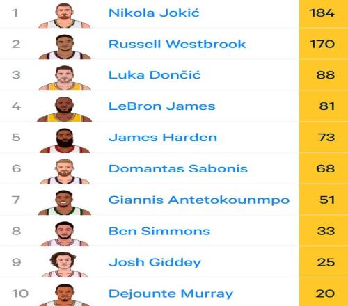 威少的第一,看起來(lái)還是很穩(wěn)——領(lǐng)先約基奇23次。
