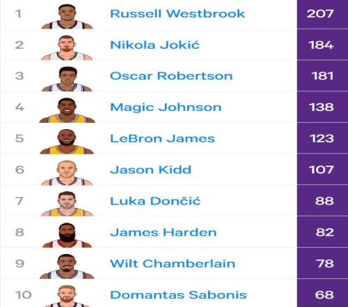 當(dāng)然,威少的207次依然是歷史第一。約基奇要超越,還得再打至少一個(gè)賽季。23次的差距,說(shuō)大不大,說(shuō)小不小。按約基奇這賽季的節(jié)奏,下賽季全明星前后,基本就能追平。
