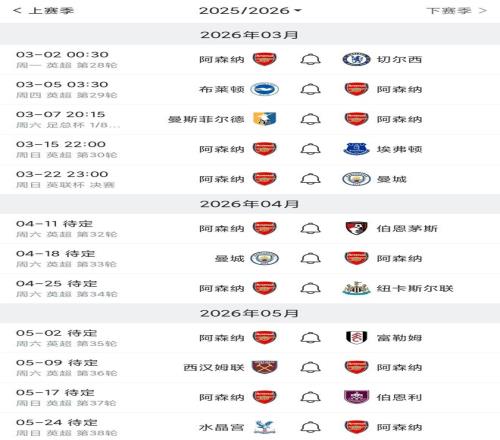 阿森納剩余英超賽程
