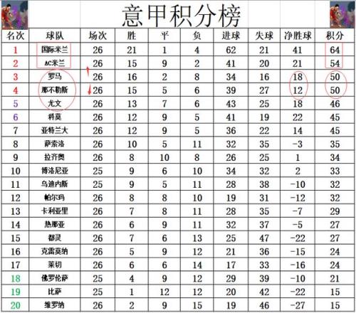 積分榜方面,AC米蘭主場爆冷被帕爾馬絕殺后,近2輪只拿到1分,國米那邊一波7連勝,本輪過后國米對AC米蘭的領(lǐng)先優(yōu)勢確定在10分,那不勒斯,尤文同樣是無力追趕,恐怕本賽季意甲的冠軍爭奪是要沒有懸念了。羅馬今天大勝后,憑借凈勝球優(yōu)勢超過那不勒斯升到第3位。