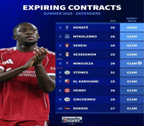 德轉(zhuǎn)列今夏合同到期十大后衛(wèi)球員身價(jià),科納特5000萬(wàn)歐居首