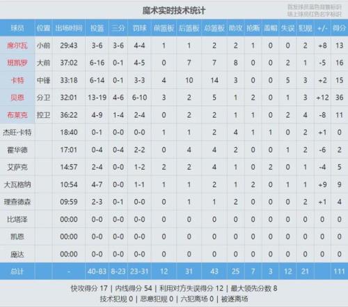 倫納德出戰(zhàn)33分鐘,25投14中,三分7中2,罰球9中7,砍下37分8板4助3斷2帽!馬瑟林替補出戰(zhàn)30分鐘,16中7拿下21分8板5助。貝恩19投13中,拿到36分5板1助2斷,正負值+12。班凱羅16分7板8助、小卡特15分14板。
