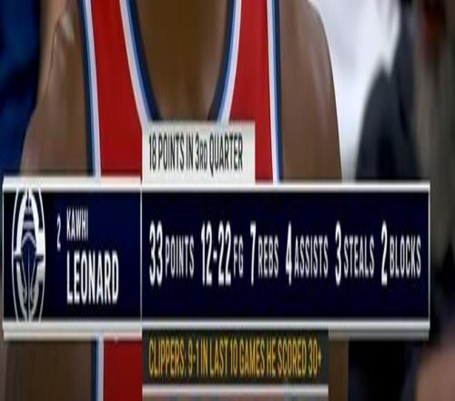 根據(jù)數(shù)據(jù)統(tǒng)計,在最近萊昂納德單場突破30分的比賽中,快船的戰(zhàn)績是9勝2負(圖片中的數(shù)據(jù)是轉播方在比賽期間給出的,不算上本場比賽)。此役,萊昂納德25投14中,得到37分8籃板4助攻。