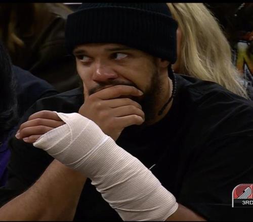 因左手骨折缺席的狄龍,本場出現(xiàn)在場邊為隊友加油