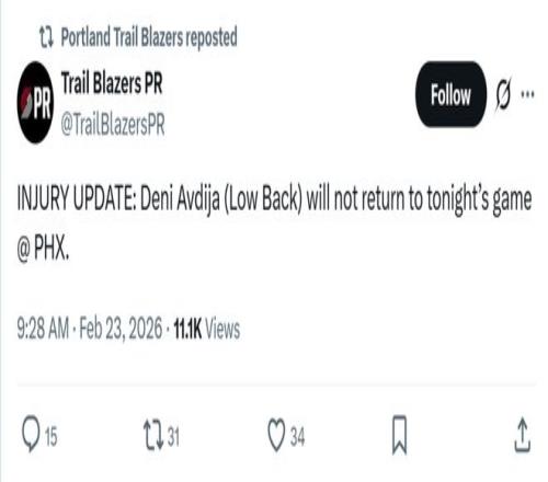 阿夫迪亞開局后不久傷退,開拓者官方宣布其因腰部受傷退出本場比賽。