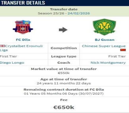 德轉顯示,馬里中場孔特從哥里迪拉加盟北京國安的轉會費為65萬歐。