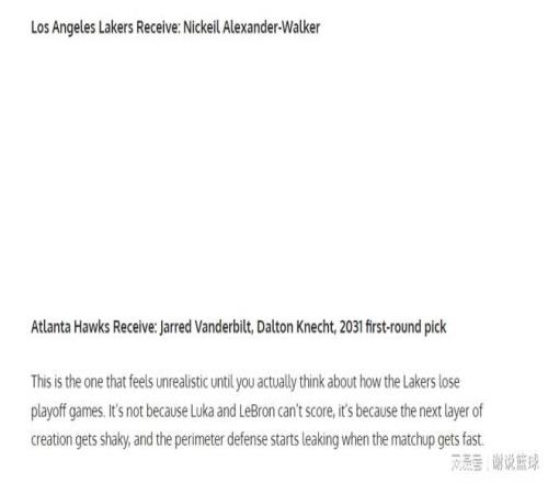 那么湖人如果有機(jī)會(huì)拿到亞歷山大-沃克,送走范德比爾特和克內(nèi)克特,似乎就顯得不值一提了。因?yàn)檫@兩名球員,就沒什么市場(chǎng)行情,范德比爾特頂多是合格替補(bǔ)輪換,但薪資卻有些高了??藘?nèi)克特則直線下滑,現(xiàn)在根本沒什么機(jī)會(huì),所以對(duì)于老鷹來說,這筆交易方案最大收益,應(yīng)該就是等著如果2031年湖人競(jìng)爭(zhēng)力下滑,甚至直接展開重建,那個(gè)選秀權(quán)順位會(huì)比較高。