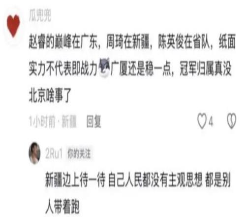 昨天趙睿的言論引發(fā)了無數(shù)人的熱議,特別是新疆球迷質疑北京會不會奪冠的時候,球迷卻回復:新疆邊上待一待自己人民都沒有主觀思想都是別人帶著跑。這樣的話語出來之后引發(fā)了無數(shù)人的不滿,不管是新疆球迷,還是CBA的球迷,全部都在表達不滿。