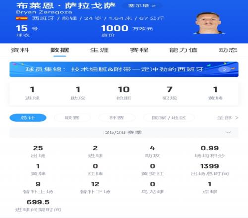 薩拉戈薩現(xiàn)年24歲,西班牙籍前鋒。本賽季他為塞爾塔出戰(zhàn)25場,貢獻(xiàn)2粒進(jìn)球和4次助攻。目前其德轉(zhuǎn)身價為1000萬歐。