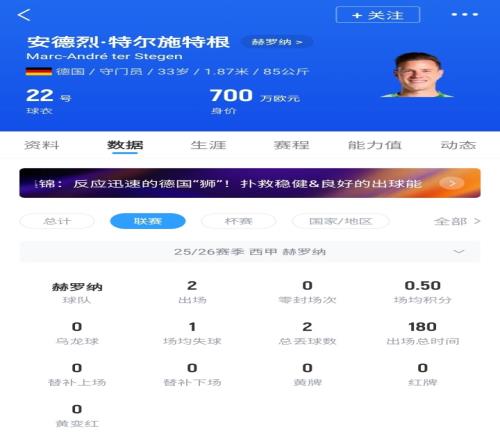 33歲的特爾施特根冬窗剛剛租借加盟赫羅納,僅出戰(zhàn)2場比賽。