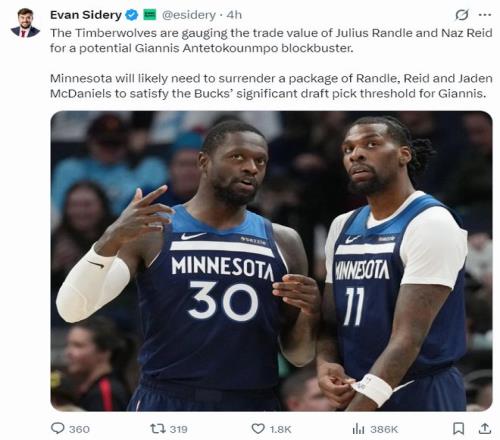《福布斯體育》記者埃文-斯迪瑞也報(bào)道,明尼蘇達(dá)森林狼也開始對(duì)字母哥競(jìng)價(jià),為了滿足雄鹿的需求,森林狼已經(jīng)愿意在揚(yáng)尼斯的交易中納入里德、蘭德爾、麥克丹尼爾斯等人。