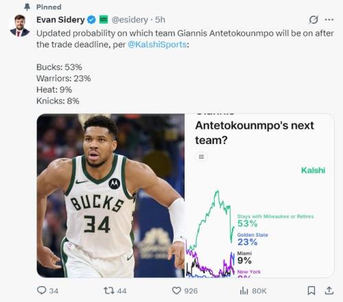 不過最新的揚(yáng)尼斯下家概率已經(jīng)更新,交易截止日后留守雄鹿53%最高,勇士23%,熱火9%,尼克斯8%,看起來揚(yáng)尼斯去哪兒很有可能要延續(xù)到休賽期。