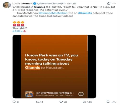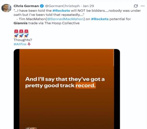 早在1月28日,ESPN記者布蘭德-麥克馬洪的播客節(jié)目中,他就說(shuō)過(guò):我只想告訴你們,揚(yáng)尼斯交易火箭一事根本不可能,火箭對(duì)現(xiàn)有陣容一如既往的耐心。