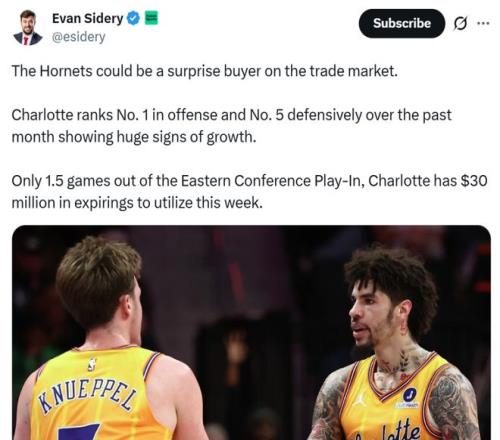 在豪取7連勝強(qiáng)勢北伐的同時,黃蜂隊(duì)還手握3000萬到期合同,美記Evan Sidery曝他們將成為交易截止日前的黑馬之一。