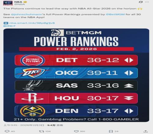 北京時間2月3日上午,NBA官方公布了最新一期的戰(zhàn)力榜,活塞連續(xù)兩周高居聯(lián)盟第一,雷霆屈居第二,馬刺反超火箭升至第三。來看看前十排名: