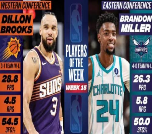 NBA官方公布了第15周的東西部周最佳球員,東部由黃蜂前鋒米勒當(dāng)選,西部由太陽后衛(wèi)狄龍當(dāng)選。米勒上周場均砍下26.3分+5.8籃板+2.3助攻,命中率高達50%,帶領(lǐng)黃蜂隊取得4勝0負的戰(zhàn)績。據(jù)統(tǒng)計,這是米勒生涯首次拿到周最佳。狄龍上周場均貢獻28.8分+4.5籃板+2.8助攻,投籃命中率53.5%,三分命中率高達54.5%,帶領(lǐng)太陽隊取得3勝1負的戰(zhàn)績。據(jù)統(tǒng)計,這也是狄龍生涯首次獲此殊榮。除此之外,騎士隊的阿倫、尼克斯隊的哈特、活塞隊的康寧漢姆、76人隊的恩比德、湖人隊的東契奇、火箭隊的杜蘭特、森林狼隊的華子、雷霆隊的亞歷山大和快船隊的小卡等球星獲得了周最佳提名。