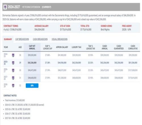 小薩今年29歲,他跟國(guó)王的合同是四年1.86億含有激勵(lì)條款,本賽季薪水4233萬(wàn),小薩還余下三年合計(jì)1.47億,這份合同真的不算小,而且本賽季小薩因?yàn)閭〉年P(guān)系數(shù)據(jù)大幅下滑,場(chǎng)均29.6分鐘,拿到14.3分11.2籃板4.2助攻1搶斷0.18蓋帽,命中率53.6%,三分命中率16%。