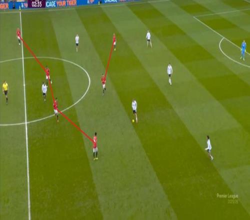 在有球的時(shí)候,本場(chǎng)比賽的曼聯(lián)呈現(xiàn)出清晰的三個(gè)半形態(tài)。