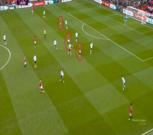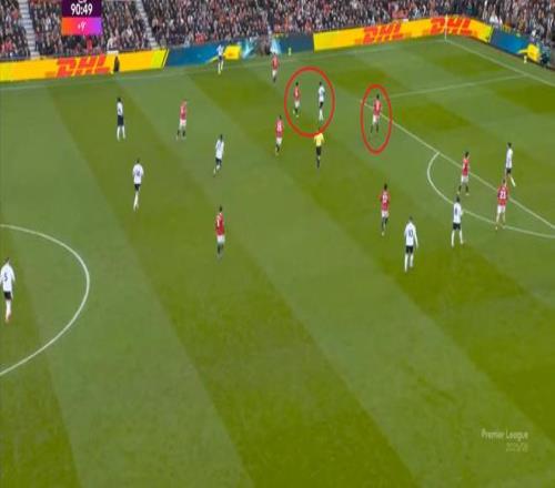 所以在守轉(zhuǎn)攻當(dāng)中,富勒姆在開(kāi)場(chǎng)還曾抓住曼聯(lián)無(wú)法及時(shí)轉(zhuǎn)換的防守體系漏洞,富勒姆起球打身后的時(shí)候,曼聯(lián)只有三個(gè)后衛(wèi)鎮(zhèn)守最后一線:
