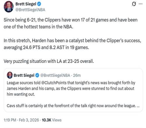 名記Siegel隨后發(fā)文確認是哈登與其團隊向球隊管理層提出交易申請,快船隊對此感到很震驚,但還是同意了。