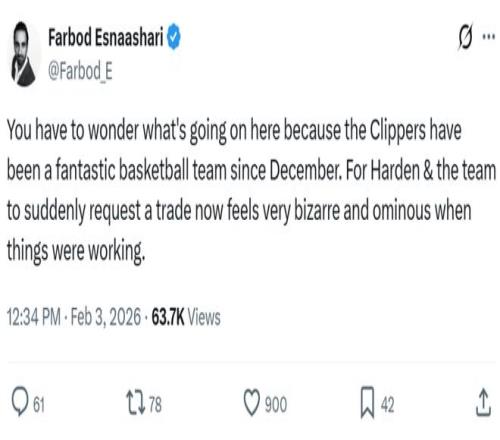 快船隊記Farbod Esnaashari第一時間發(fā)文吐槽并表示是哈登團隊提出交易申請,他寫道:“真好奇到底發(fā)生了什么,從去年12月份至今快船隊表現(xiàn)一直非常出色,結(jié)果哈登與其團隊突然提出交易申請,這讓人感到費解,也讓人感到有些不安,尤其是一切順利時。”