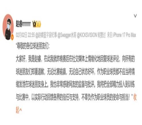 CBA方面在這兩天有個比較重磅的消息:北京男籃后衛(wèi)趙睿因為在網(wǎng)絡上亂說話,已經(jīng)公開道歉。