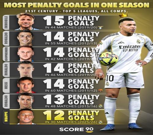 體育播報02月03日宣 Score90統(tǒng)計了21世紀(jì)五大聯(lián)賽球員單賽季最多點球進(jìn)球榜,姆巴佩本賽季至今目前以12粒點球位居第七位。