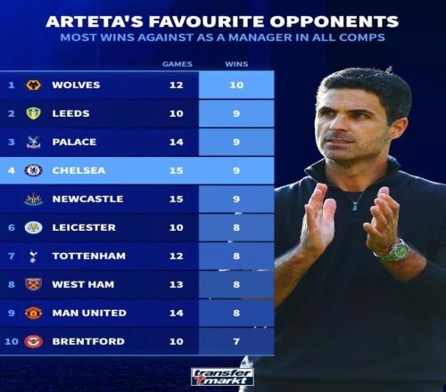 阿爾特塔教練生涯取勝場次最多的10個(gè)對(duì)手: