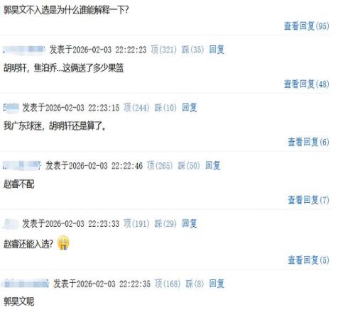 賽后球迷們?cè)u(píng)論區(qū)議論最多的話題有3個(gè),爭(zhēng)議最大的第一個(gè)問(wèn)題,郭昊文怎么沒有入選?第二個(gè)問(wèn)題,趙睿怎么還能進(jìn)?第三個(gè),是周琦為何這次也落選了?