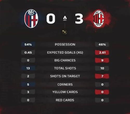 全場比賽結束,米蘭3-0博洛尼亞。