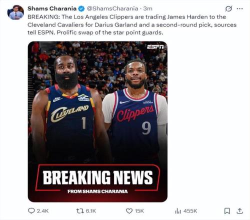 北京時間2月4日,根據(jù)ESPN記者Shams的報道,騎士隊與快船隊達(dá)成重磅交易,快船將哈登送入克利夫蘭換取加蘭、1個次輪簽。