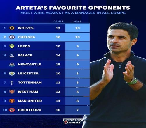 喜歡的對(duì)手,切爾西是阿爾特塔贏球最多的球隊(duì),16場(chǎng)取得10勝