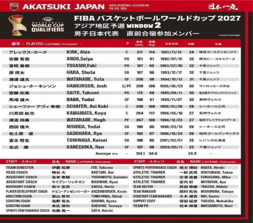 北京時(shí)間2月4日,在中國(guó)男籃公布21人集訓(xùn)名單后,如今日本男籃公布15人集訓(xùn)名單,由渡邊雄太領(lǐng)銜,還有兩位歸化球員霍金森與阿萊克斯·柯克,而在公牛效力的河村勇輝不回歸。