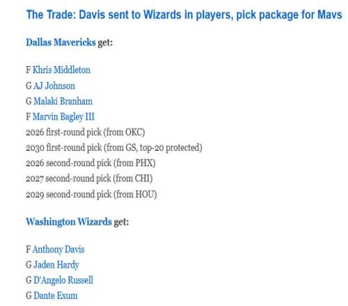 獨(dú)行俠得到:米德爾頓、AJ-約翰遜、布蘭納姆、巴格利、2026年首輪簽(來(lái)自雷霆)、2030年受保護(hù)首輪簽(來(lái)自勇士,前20保護(hù))、2026年次輪簽(來(lái)自太陽(yáng))、2027年(來(lái)自公牛)和2029年次輪簽(來(lái)自火箭)。