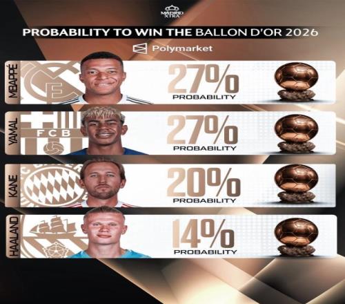 02月04報道 相關(guān)機構(gòu)近期更新了2026年金球獎的獲獎概率預(yù)測,目前姆巴佩與亞馬爾并列領(lǐng)跑,兩人獲獎概率均為27%,凱恩和哈蘭德則緊隨其后。