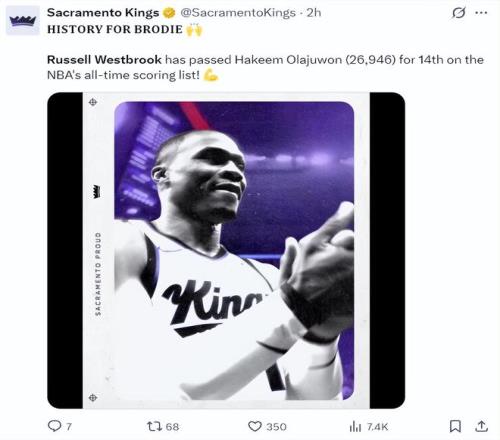 國(guó)王官方慶祝威少歷史總得分榜升至第14位,超越奧拉朱旺26946分,下一個(gè)將追逐埃爾文-海耶斯的27313分。
